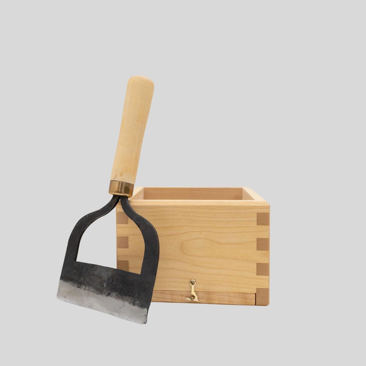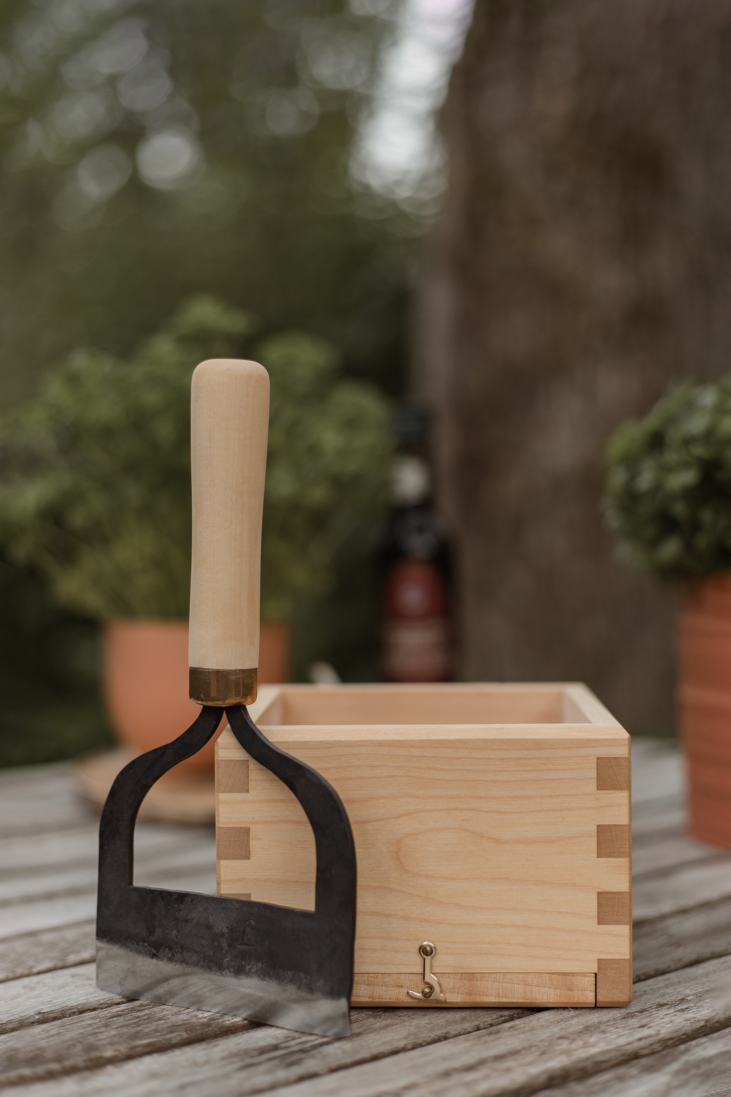 Keittiöhakkurin terä on käsin taottua hiiliterästä, kahvassa sorvattu koivukahva ja messinkihela. Hakkurilaatikko sormiliitoksin tehty ja vahattua suomalaista koivua, eikä se ime hajuja tai makuja. Messinkilukon ja avattavan pohjansa ansiosta hakkurilaatikko on helppo tyhjentää vaikkapa suoraan paistinpannulle tai salaattiin. Avattuna se on kätevä puhdistaa juoksevan veden alla. Väliajat keittiöhakkuri toimii kauniina koriste-esineenä keittiössä, eikä ole tavaton käyttää kaunista laatikkoa pienten maustepurkkien säilyttämiseen.
